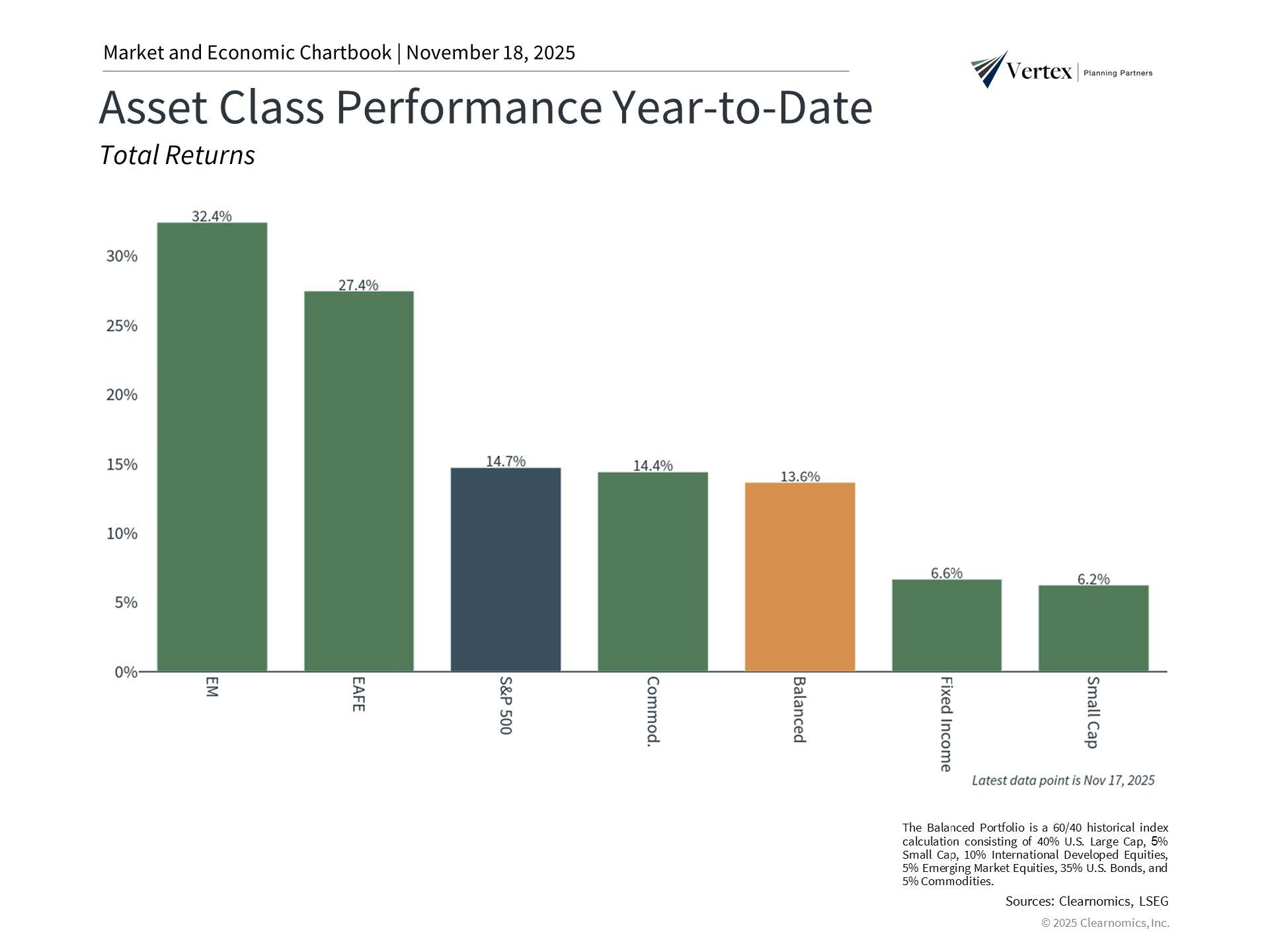 The bond market’s positive returns are important to highlight after the challenging interest rate and inflation environment of recent years. As rates have stabilized and the Federal Reserve has begun easing monetary policy again, bond prices have recovered. This demonstrates why holding both stocks and bonds remains important for portfolios in terms of both balance and income generation.