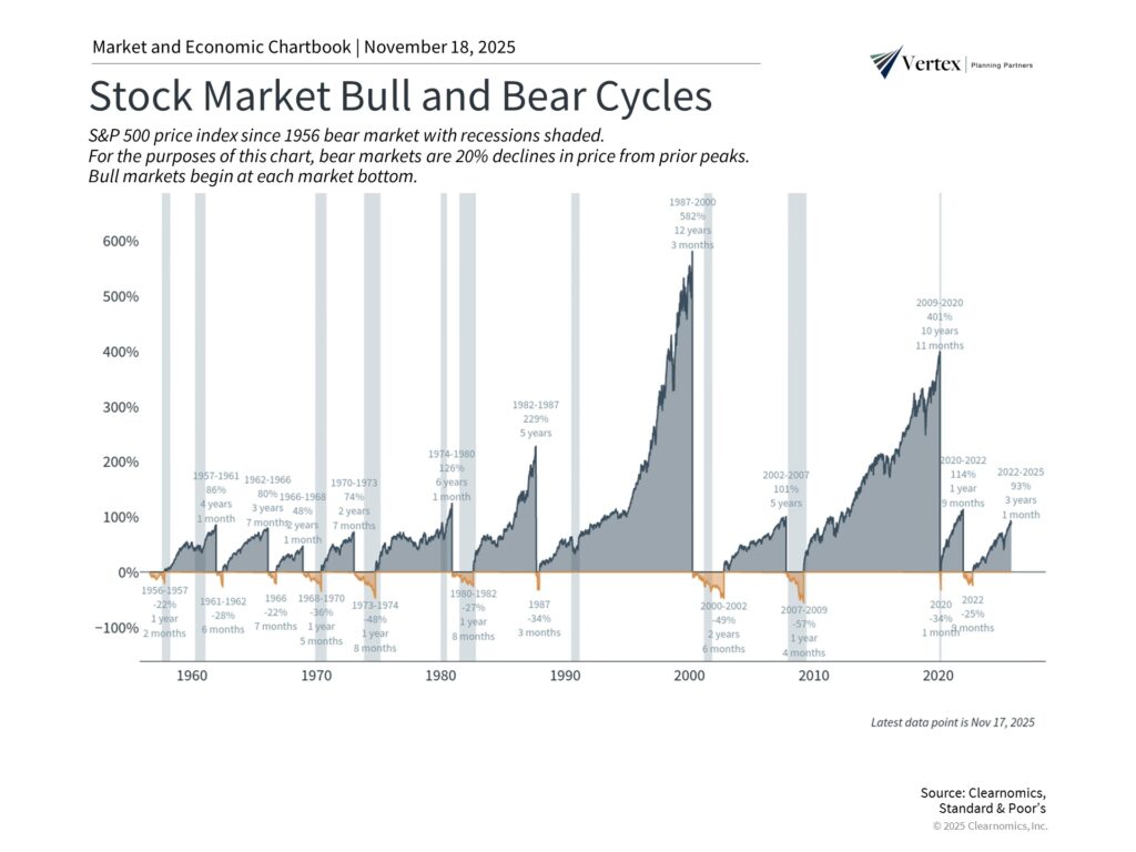 First, investors can be thankful that financial markets have performed well this year despite market swings. This bull market cycle, which began after the market bottom in October 2022, is now entering its fourth year.