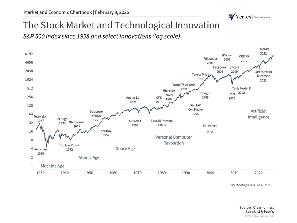 Today, AI represents the next phase of this transformation, and as with every major technological shift, markets are trying to assess what it means for specific sectors and the overall economy. For long-term investors, maintaining perspective on how these cycles have unfolded in the past can provide helpful clarity.
