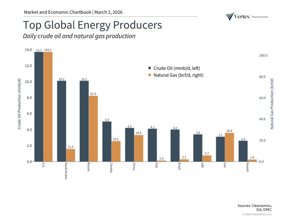 However, some perspective is needed. Current oil prices remain well below the 2022 peak of nearly $128 per barrel when Russia invaded Ukraine. Today’s environment is quite different. In 2018, the U.S. also became the world’s largest producer of oil and natural gas, with current domestic production exceeding other major producers such as Saudi Arabia and Russia. While the U.S. still relies on global energy markets, this level of production helps to insulate the domestic economy from supply disruptions.