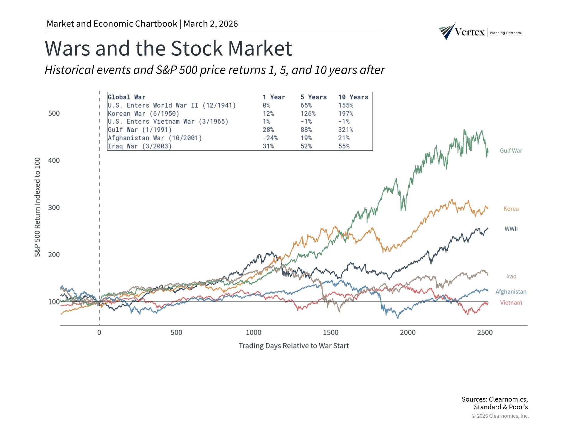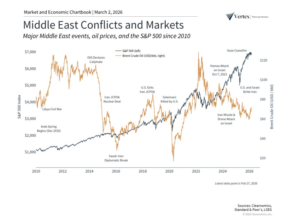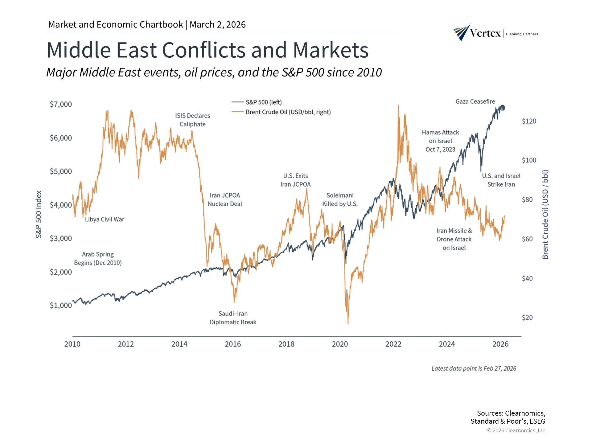 For long-term investors, the most important lesson from past geopolitical conflicts is the value of staying invested. It’s natural to feel uneasy when headlines describe military strikes, retaliatory attacks, and the possibility of a wider regional war. These events involve real human consequences and are unlike the typical flow of market news about earnings, valuations, and economic data.