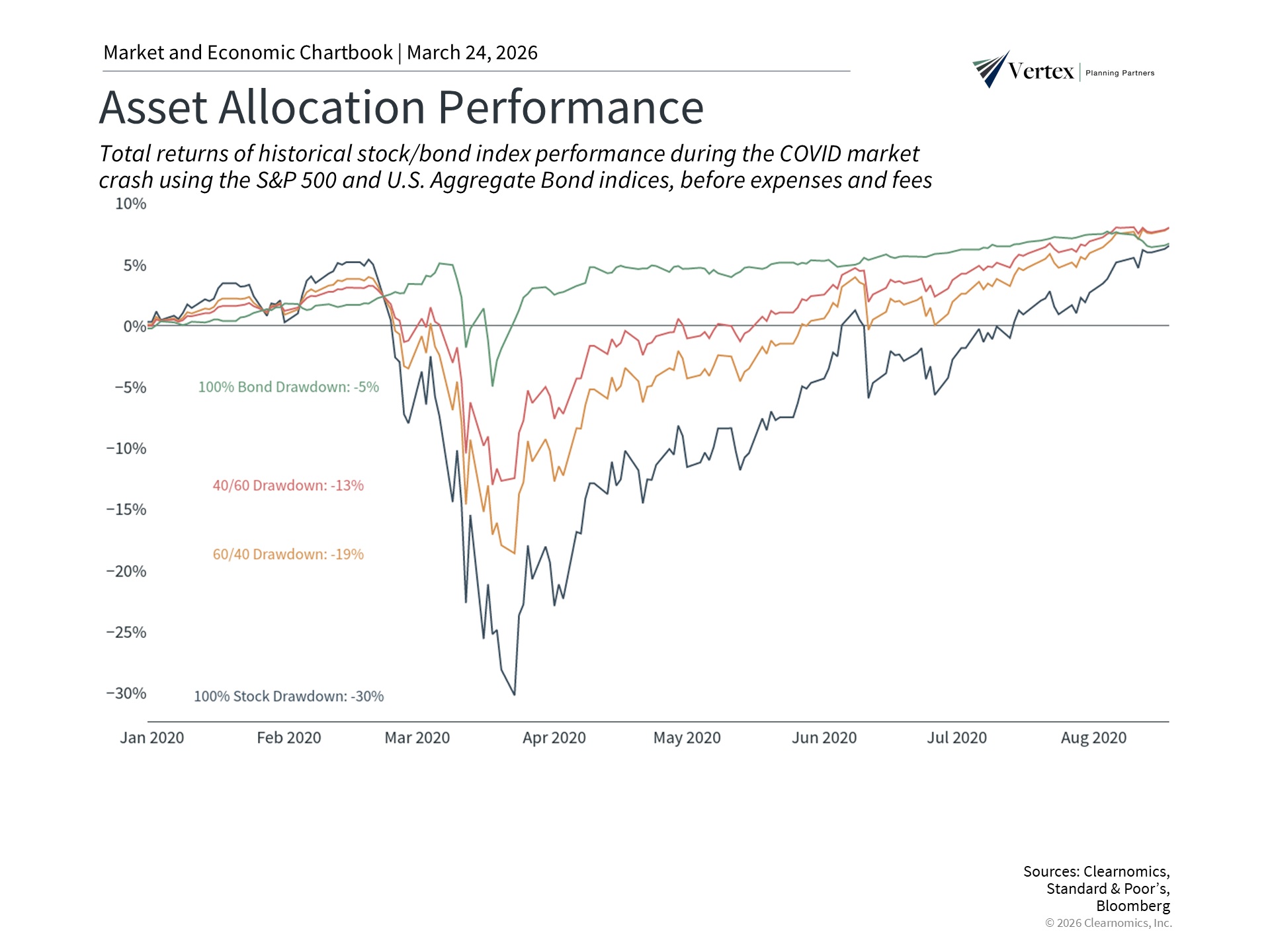 The accompanying chart highlights one of the most volatile periods in history during the pandemic in 2020. Different asset allocations behaved in unique ways, with those that were more balanced across asset classes experiencing smaller swings. While these portfolios all ended around the same level after this period, the real issue is whether investors would have overreacted when the stock market was down 20% or 30%.
