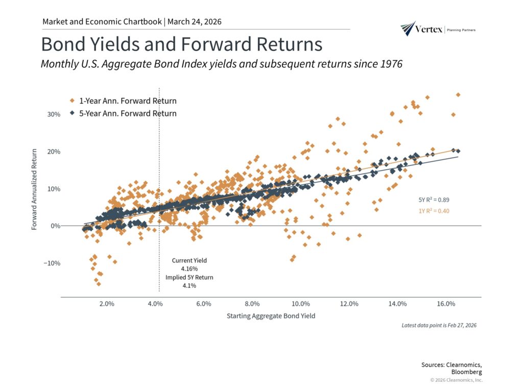 For long-term investors, bond yields remain attractive compared to the previous decade. Current bond yields offer meaningful income potential that was simply unavailable during much of the past decade. Specifically, the yield on the U.S. Aggregate Bond Index is 4.5%, well above the 2.9% average since 2009. Investing when yields are attractive is also historically correlated with healthy total returns, as shown in the accompanying chart.