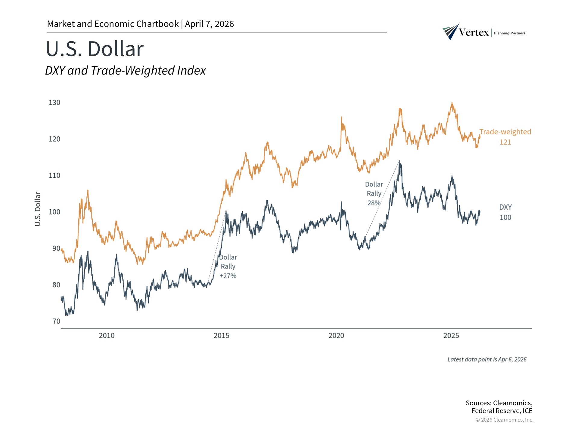 Global events have been at the center of financial market activity, with high oil prices, geopolitics, and new tariff rules capturing investor attention. Behind many of these trends, however, is the level of the U.S. dollar. While currency movements have received less attention in recent weeks, they continue to have important effects on portfolios by influencing international investments, commodities like gold, and the broader economic environment.