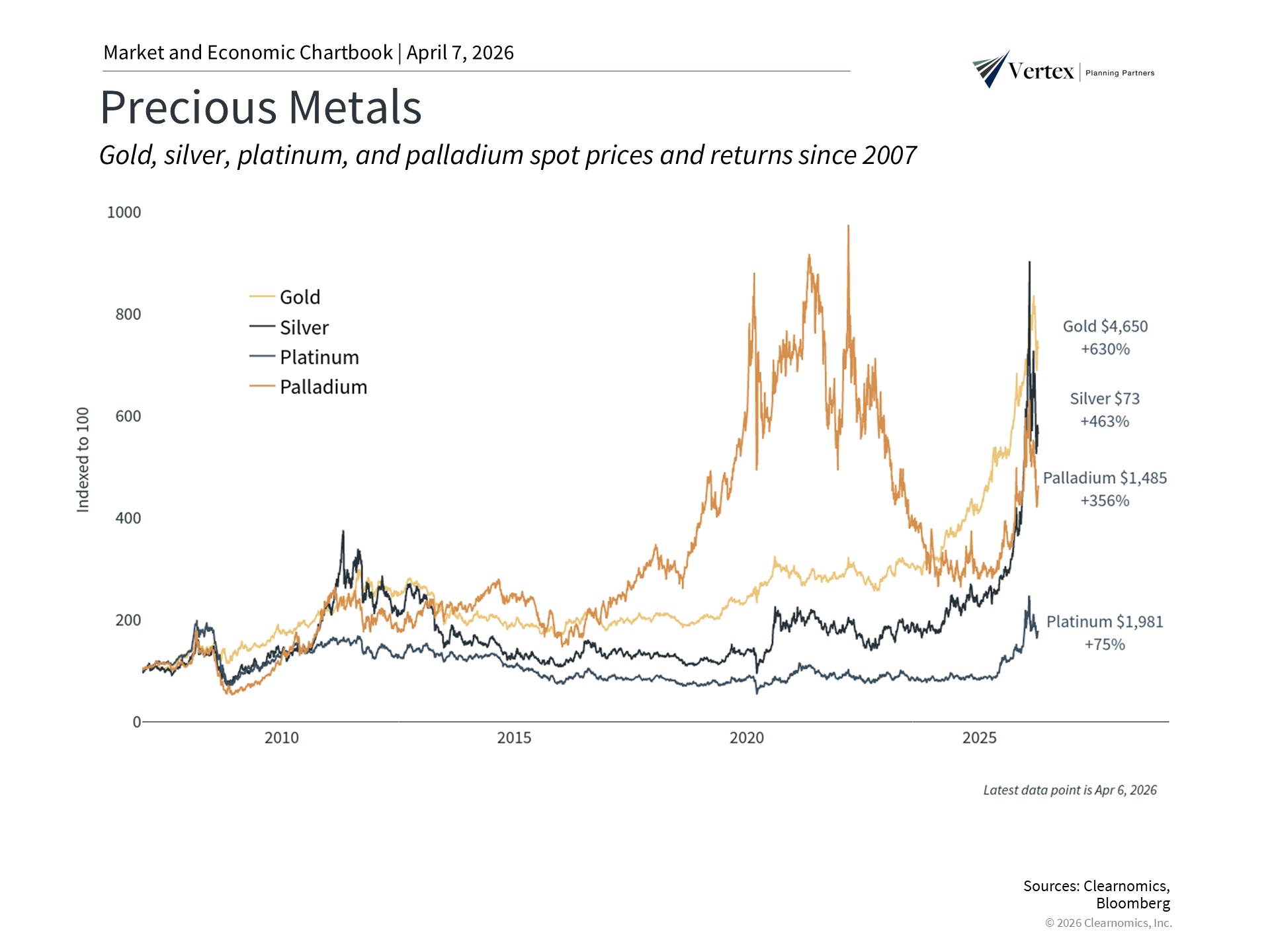 Gold has understandably been one of the most discussed assets over the past few years, and is affected by many of the same factors as the dollar. Rising fiscal deficits, easing monetary policy, geopolitical tensions, and concerns about currency debasement all fit the narrative for gold. These factors contributed to a strong multi-year rally that pushed prices to all-time highs as recently as late January when gold reached $5,417 per ounce.