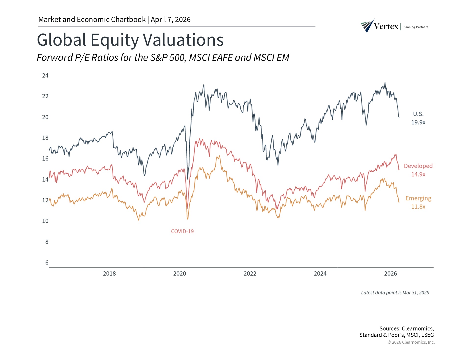 Beyond currency effects, valuations also play an important role. International markets have traded at a meaningful discount to U.S. equities for some time, with developed markets trading with a price-to-earnings ratio of 14.9x and emerging markets 11.8x, compared to 19.9x for the S&P 500. This does not predict returns over the short run and is thus not a timing indicator. Instead, this difference in valuations is an important input into constructing balanced portfolios when deciding how to weigh different assets.