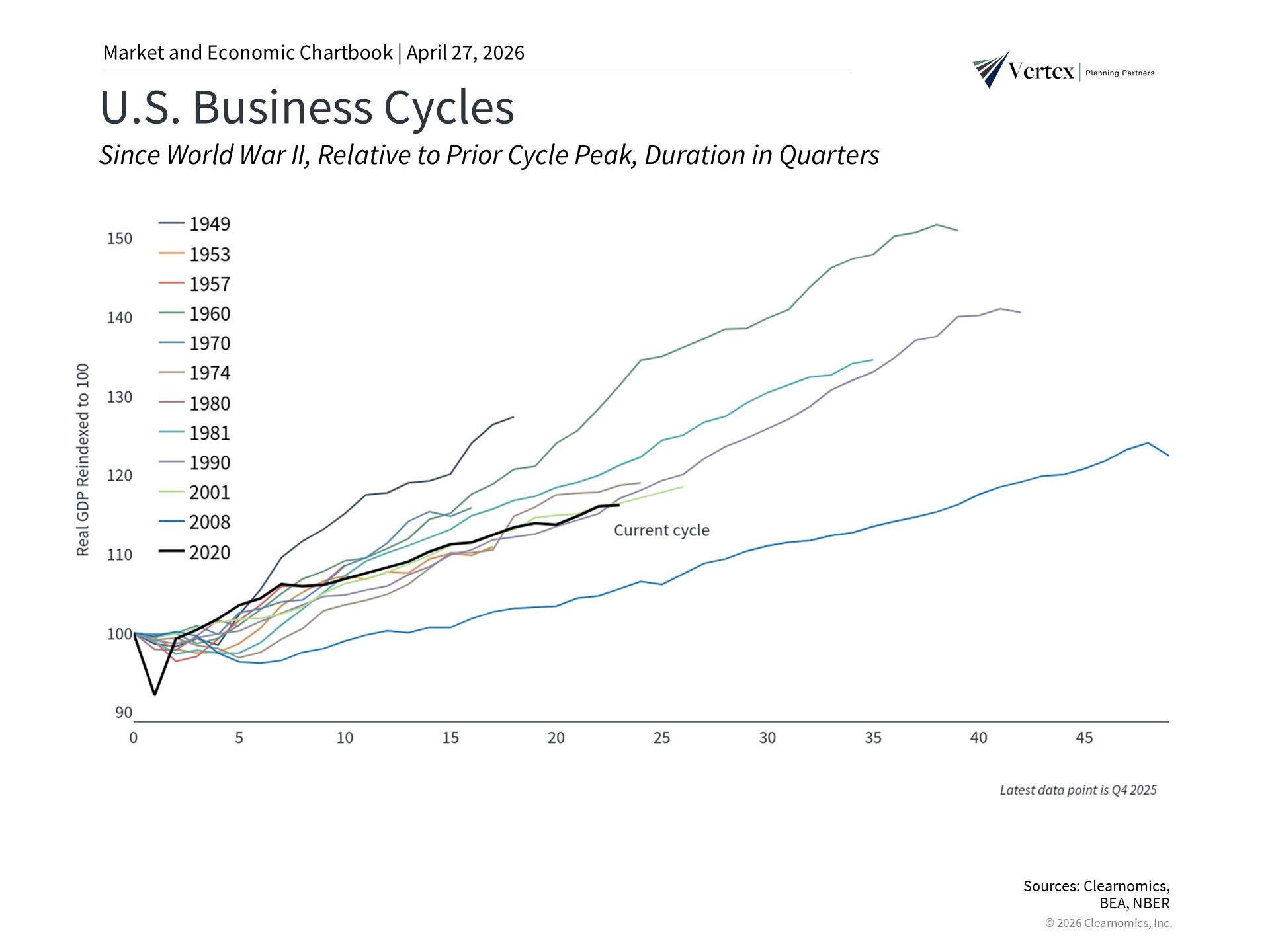 The current business cycle has technically been running two-and-a-half years longer than the market cycle. The last official recession, as determined by the National Bureau of Economic Research, was the brief but sharp response to the pandemic in 2020. Since then, there have been quarters of slower growth and occasional predictions about recessions, none of which have taken shape.