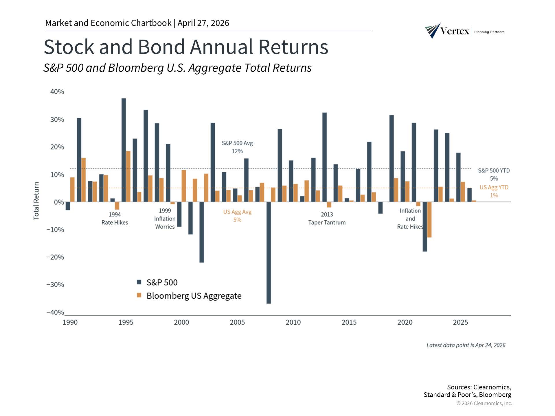 This pattern is consistent with what history shows across cycles. Every period seems to raise the question of whether “this time is different” when it comes to the relationship between asset classes. In the 1970s, inflation challenged traditional portfolios. In the dot-com era, technology stocks became extremely popular, despite a lack of corporate profits, making other sectors appear boring. In 2022, rising rates created simultaneous pressure on both stocks and bonds. There are echoes of all of these challenges today.